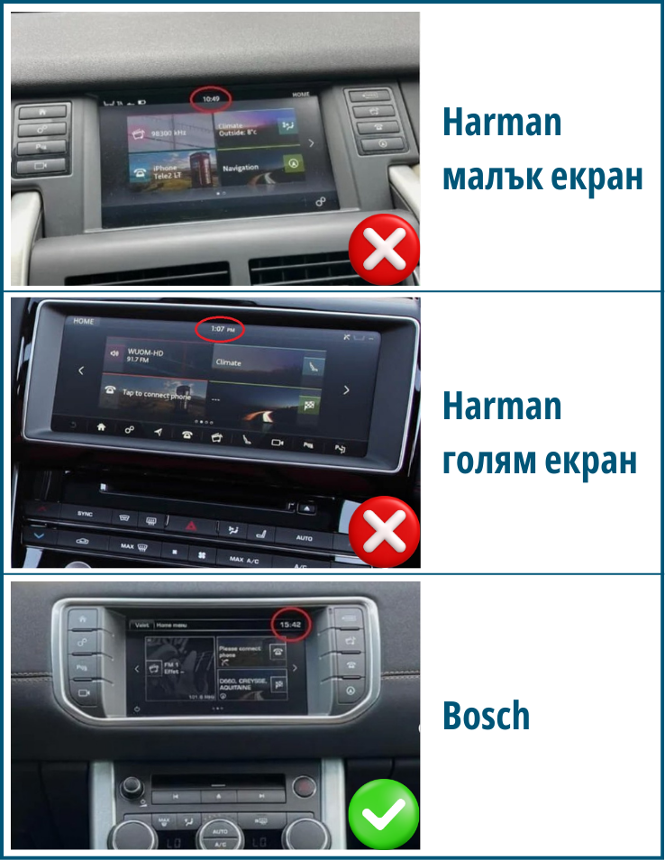 Важно: модулът е съвместим с автомобили Land Rover и Jaguar с Bosch система. Ако Вашият автомобил е с Harman мултимедийна фабрична навигация, подходящият модел може да намерите тук. Harman системите се разпознават по часовника по средата. MMI Box е проектиран специално за автомобили Land Rover и Jaguar (2012–2016) с фабрични Bosch мултимедийни системи. Устройството добавя безжичен Apple CarPlay и Android Auto, като разширява възможностите на оригиналната инфотейнмънт система без нужда от подмяна. |