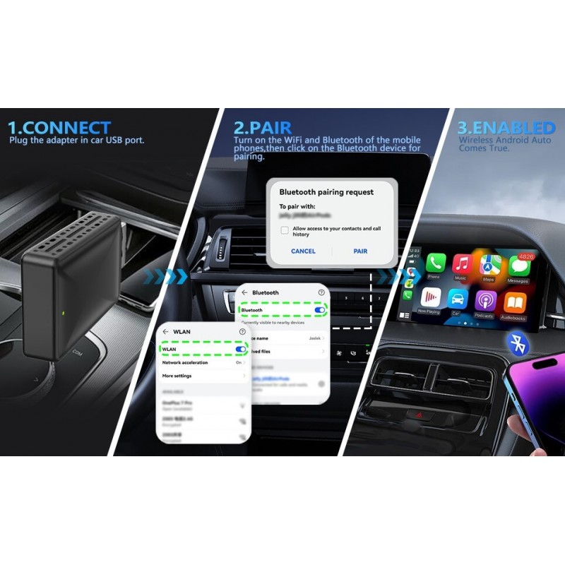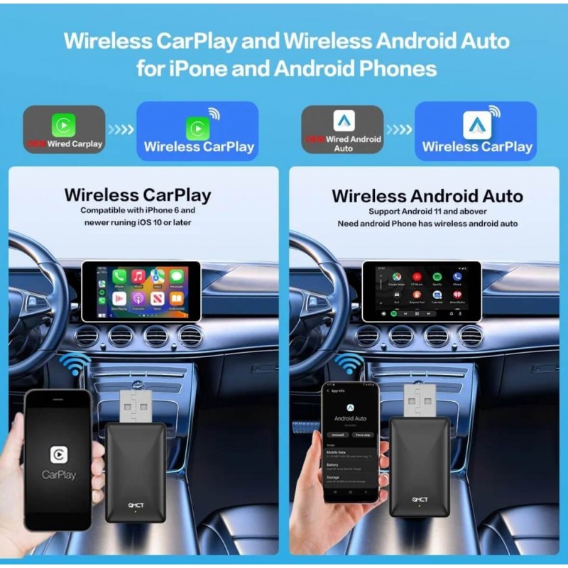 Безжичен USB адаптер за Android Auto и Apple CarPlay, който позволява лесна и сигурна безжична връзка с фабричната система на автомобила. Поддържа Android 5.0+ и iOS 10+, осигурява бързо автоматично свързване и удобство при управление през сензорен екран и воланни бутони. Важно: За да бъде съвместимо устройството с вашия автомобил, трябва да бъдат изпъленени следните условия: