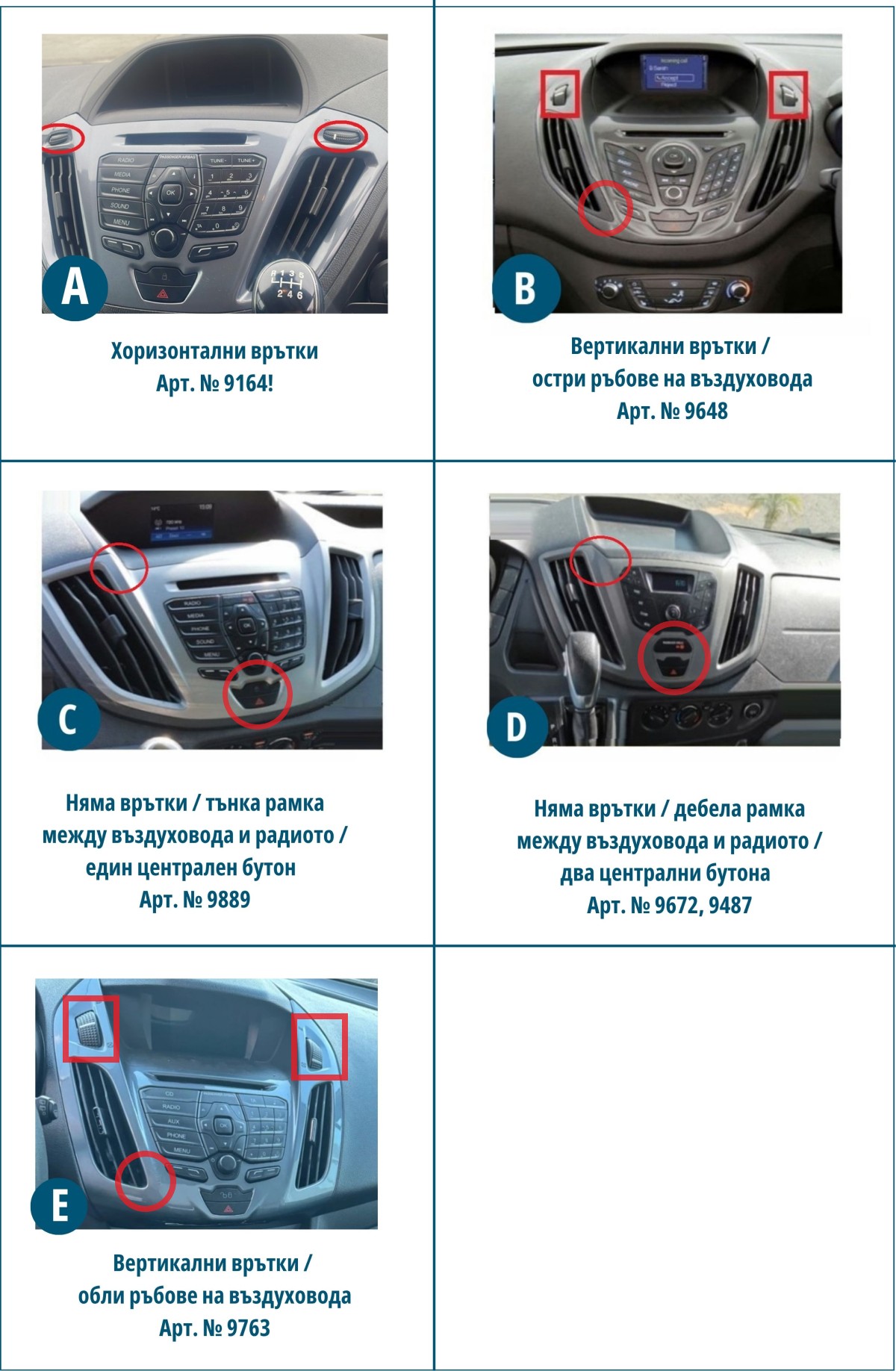 | Внимание!За да бъде мултимедията напълно съвместима, не пропускайте да проверите таблото на Вашия автомобил: Тип "A" - подходящите модели може да разгледате тук. Тип "B" - мултимедията е съвместима! Тип "C" - подходящите модели може да разгледате тук. Тип "D" - подходящите модели може да разгледате тук. Тип "E" - подходящите модели може да разгледате тук. Ако Вашето табло е различно, моля изпратете снимка на централната конзола с радиото и въздуховодите на парното, за да проверим съвместимостта! Нашият екип ще Ви консултира безплатно и ще Ви препоръча точния модел мултимедия за Вашия автомобил. |