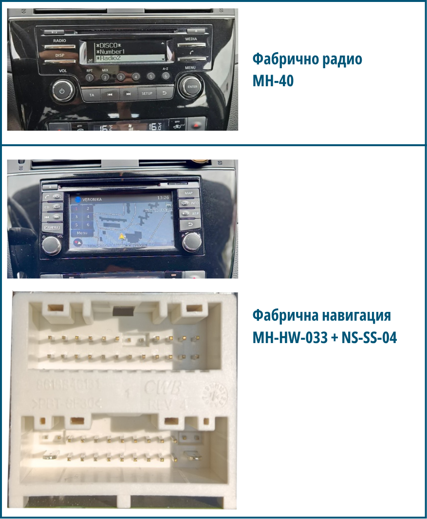 • Ако автомобилът Ви е с фабрична навигация и букса като на снимката, мултимедията се изпраща с кабел MH-HW-033 + NS-SS-04.