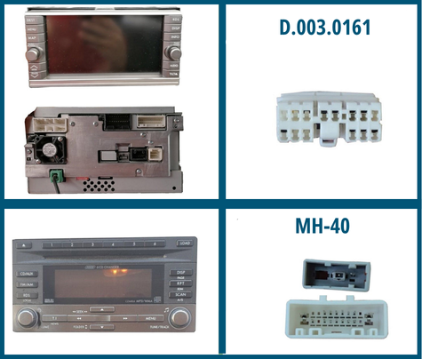 Внимание!За да бъде мултимедията напълно съвместима с Вашия автомобил, не пропускайте да проверите буксите на оригиналното си радио. Изпращаме букса MH-40, ако при Вас е букса D.003.0161, моля уточнете при поръчка на самата мултимедия Нашият екип ще Ви консултира безплатно и ще Ви препоръча точния модел мултимедия за Вашия автомобил. |