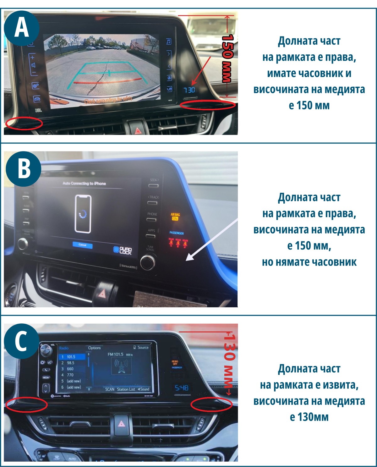 Мултимедиите, предлагани от carmedia.bg имат перфектна интеграция с оригиналните автомобилни системи и дизайн на автомобила. Ако Вашият автомобил е оборудван с тези оригинални функции: бутони на волана, фабричен усилвател на звука, бордови компютър (разход на гориво, пробег и др.), климатик, система за асистиране при паркиране, фабрична задна камера, фабрична 360-градусова камера, фабрично управление на окачването, система за следене на налягането в гумите (TPMS), управление на светлините, управление на хибридната/батерийната система и др., можете да запазите тези функции. Ако автомобилът ви има някои от тези фабрични функции, моля, потвърдете преди да направите поръчка! Забележка: фабричните функции са споменати като пример. Различните автомобили имат специфични функции, моля, свържете се с нас, за да научите повече информация за поддържаните функции преди покупка! | |