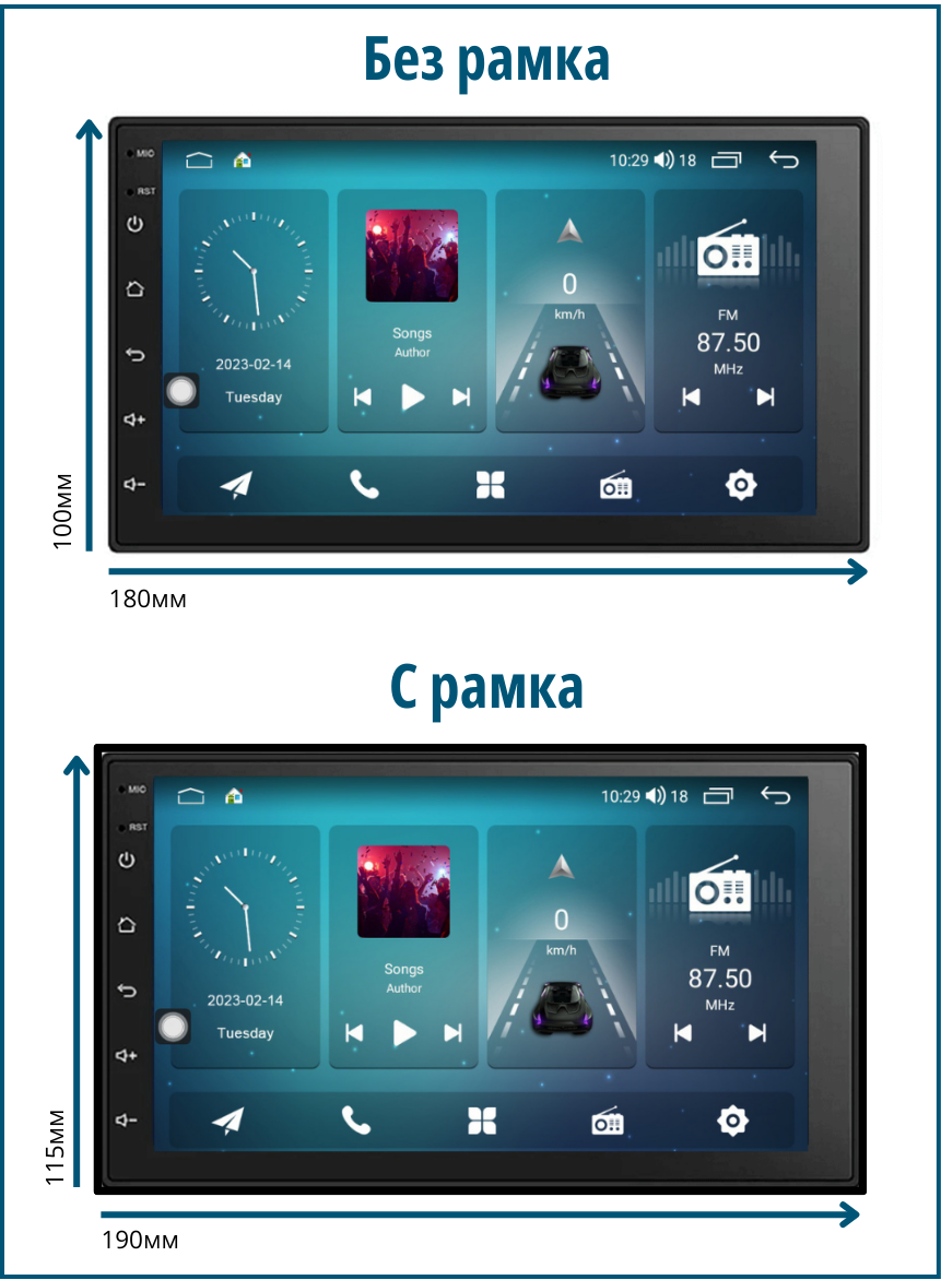 Размерът на универсалната 7-инчова мултимедия 2DIN, без рамка е 180x100mm Размерът на универсалната 7-инчова мултимедия 2DIN, с рамка е 190x115mm |