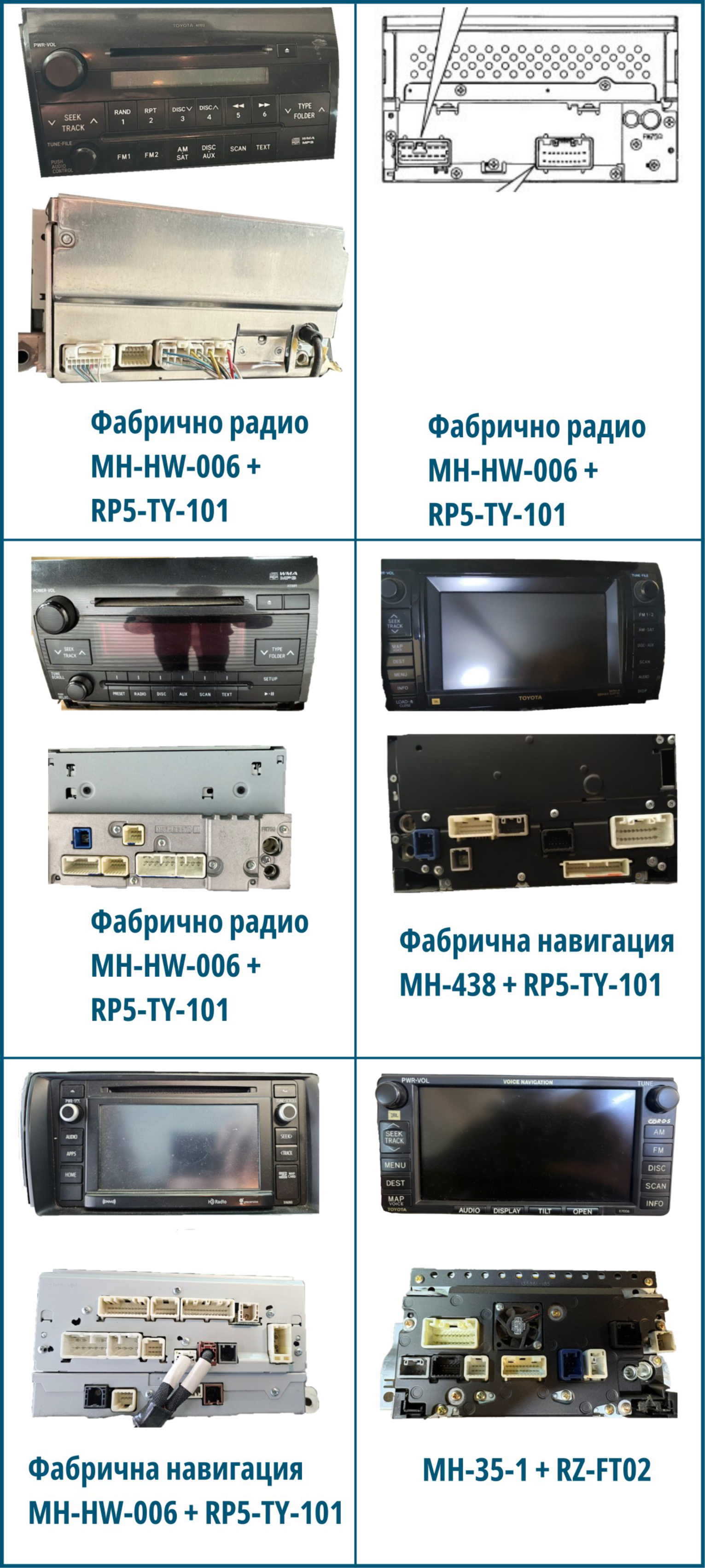 | Внимание!За модела има различно окабеляване. При поръчка е необходимо да ни информирате с кои кабели да изпратим медията. Ако Вашето радио е различно от тези на снимките, моля информирайте ни. За да бъде мултимедията напълно съвместима с Вашия автомобил, не пропускайте да проверите буксите на оригиналното си радио.