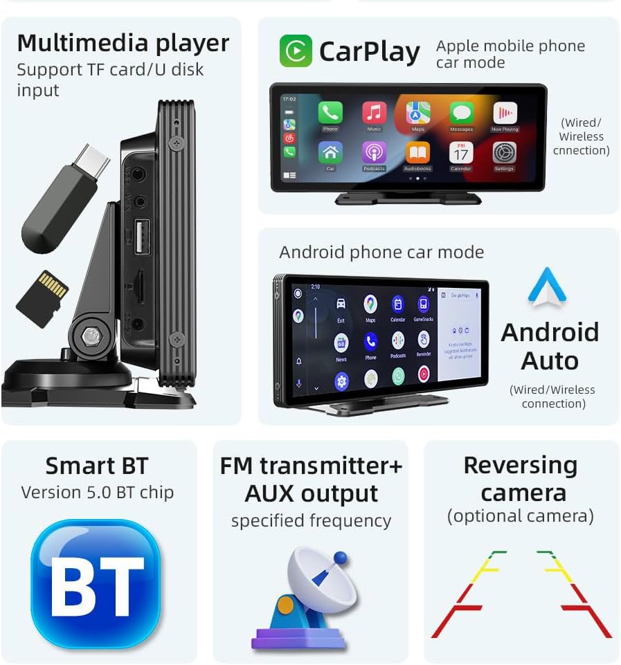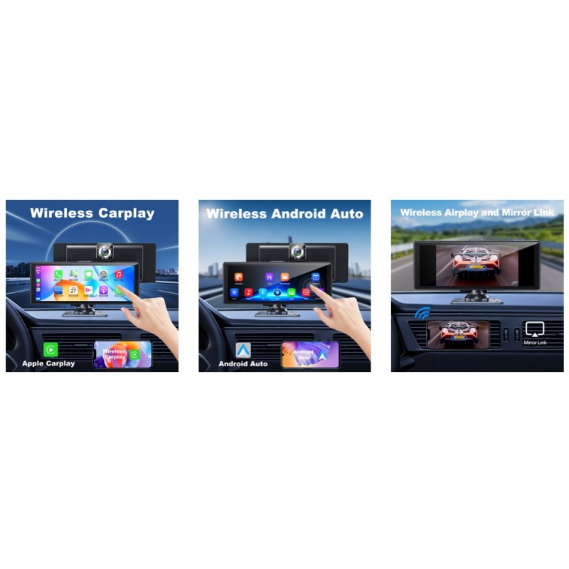Подобрете шофирането си с 9-инчовия безжичен монитор с тъчскрийн за Android Auto и CarPlay. Този многофункционален автомобилен аксесоар разполага с цветен IPS екран за детайлни изображения и поддръжка на безжична връзка с CarPlay и Android Auto за удобно навигиране. С възможност за свързване на камера за задно виждане, поддръжка на карти памет, Bluetooth връзка и лесна инсталация, този монитор подобрява мултимедийните възможности на автомобила ви и осигурява комфортно шофиране. |