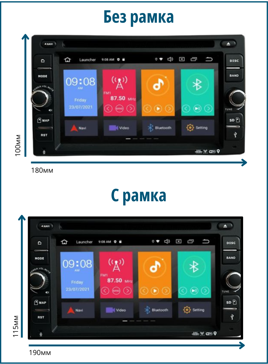Размерът на универсалната 6.2-инчова мултимедия 2DIN, без рамка е 180x100mm Размерът на универсалната 6.2-инчова мултимедия 2DIN, с рамка е 190x115mm |